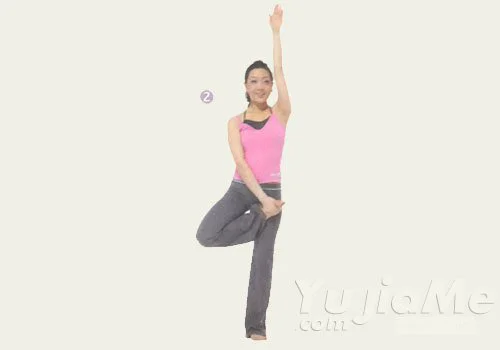 2、吸氣,右手抓住右腳,左臂伸展過頭頂,掌心向前。均勻、深長地呼吸,保持這個體式幾秒鐘。呼氣,回復到山式。換另一側重複練習。