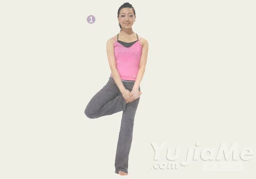 1、以山式站立。用左腿維持身體平衡,彎曲右腿,右腳腳背放在左側大腿根部,成半蓮花式。可用手輔助右腳進行練習。