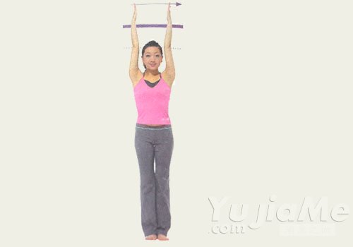 完成山式基礎式,雙臂由體前向上舉過頭頂,雙手掌心相對,肘關節伸展,保持肩膀放鬆。