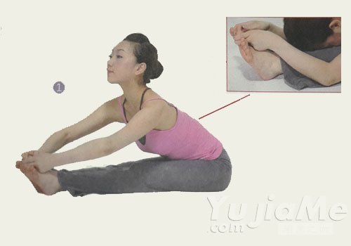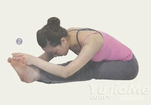1、坐在地面上,雙腿向前伸直。呼氣,伸展雙手抓住腳趾,分別用左手和右手的大拇指,食指和中指夾住左腳和右腳的大腳趾。伸展脊柱,使背部下凹。