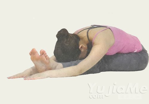 完成第四種變化式以後,把雙手向前伸直,手掌放在地面上,大拇指相交放在腳後,下巴繼續盡量向前延伸。保持這個姿勢均勻地呼吸。