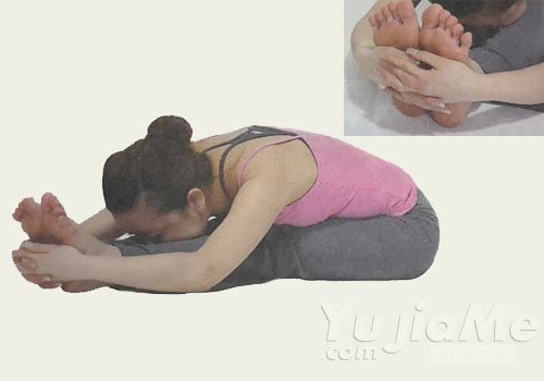 雙腿背部伸展式變化式二完成後,就把雙手放於腳底處手指相扣,並使脊柱繼續向前延伸,然後把下巴進一步向前延伸,超過膝蓋。