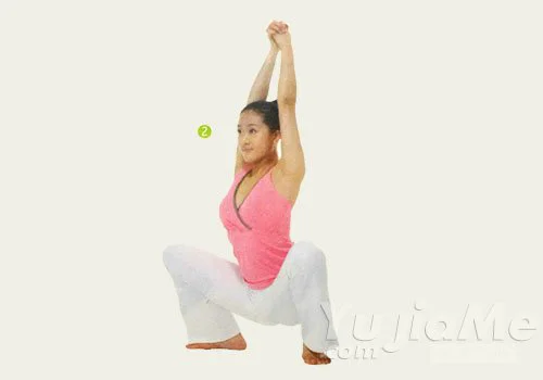 1、蹲在地面上,雙腳平放在地上,兩膝分開。手臂斜下伸直,好像手握斧頭做劈柴動作。