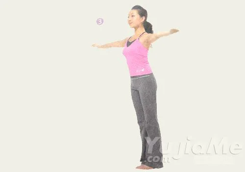 3、呼氣,頭部回正,雙臂側平舉,然後慢慢放落到站立的姿勢。