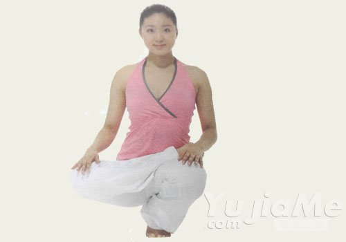 完成趾尖式第一式變化式一,將右腿盤起成半蓮花式,兩手落下分別放在對應的兩膝上,用左趾尖控制身體平衡。保持一段時間後回復,換另一側重複練習。