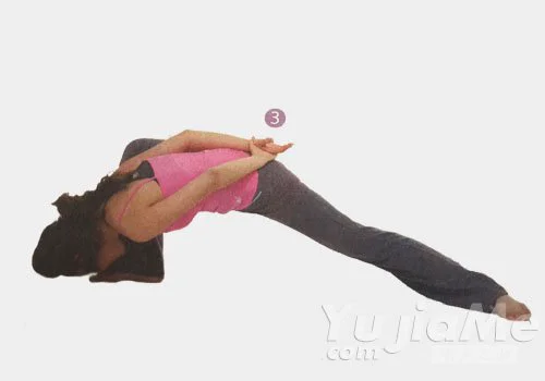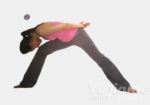 2、上身軀幹稍向右轉,呼氣,上身前屈,頭觸及右膝。