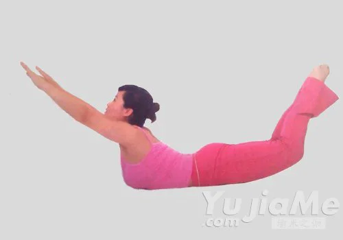 2、雙臂向頭前上方伸直,吸氣,腰腹用力使胸部和雙腿前側離地。讓手與腳在同一水平線上,使身體後屈成U形,保持一段時間。