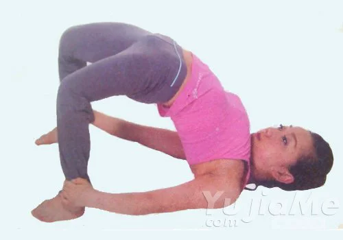 2、抬臀拱背,雙腳平放地上,雙手握住兩踝,切勿移動雙手或雙肩的位置。身體由雙腳,頸,雙肩和雙臂支持。動作保持住,用臀部肌肉收緊的力量保持身體的位置。呼吸自然穩定。