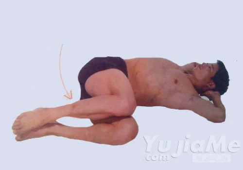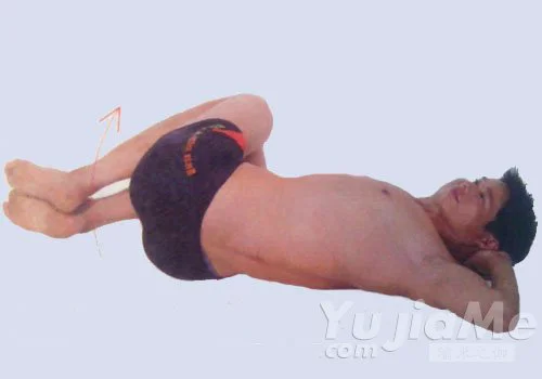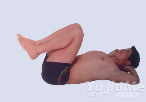 2、屈膝收腿,兩大腿盡量收緊胸部,十指相交,放在頭部後方,兩肘貼地。
