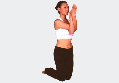 2、雙臂向前伸出,將右肘關節搭在左肘關節上,小臂盤繞,手掌合十。注意要將雙手放在鼻子前方正中的位置。