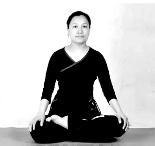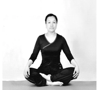 以半蓮花坐為起始動作,腰背挺直,再將左小腿繞過右小腿外側搭放在已經做好右腿的半蓮花上,大拇指和食指輕輕相觸,放在雙膝上,這種手勢用於古印度的舞蹈中,也用於瑜伽冥想姿勢中,雙肩自然放鬆(功效:靈活膝關節,使雙腿更加靈活柔韌,防治膝關節炎等)。