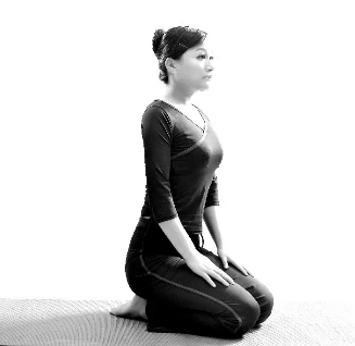 雙膝蓋併攏貼地,雙腳分開與臀部同寬,臀部坐在兩腳之間的墊子上後腳跟夾緊臀部,挺直腰背,雙手搭放在大腿根部。