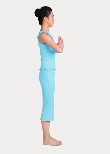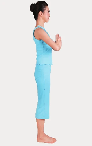 1、祈禱式:站立,腰背挺直,雙腳併攏,雙手於胸前合十,大拇指相扣抵住胸骨。保持3次呼吸。