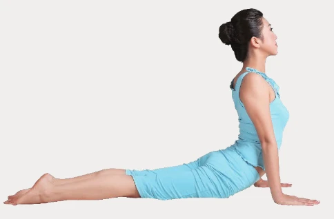 7、眼鏡蛇式:吸氣,伸直雙腿,上半身沿著地面向前滑動,知道胯部接觸到地面為止,頭部向上伸展,讓上半身後仰,眼睛看向天花板,注意不要聳肩。保持2次呼吸。