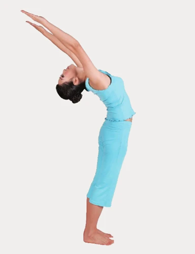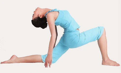 2、展臂式:吸氣,伸直雙臂上舉,邊呼氣邊讓上身向後伸展,保持2次呼吸。