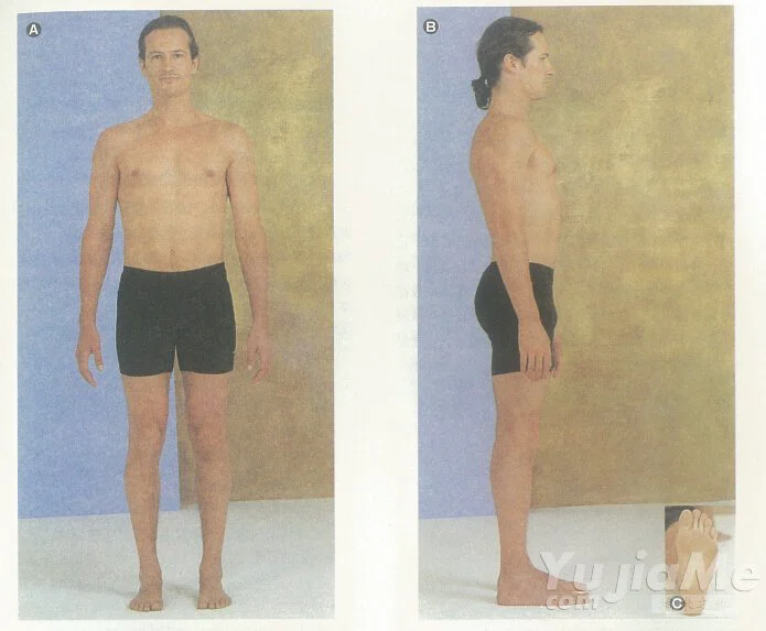 B、從側面看,你的頭頂、耳根、肩膀中間胯部中間、膝蓋後面和跺骨後應該保持一條直線,記住要放鬆膝蓋,把全身的重量平均分配到兩條腿上, 你的脖子後面要伸直。下巴與地面平行;也可以讓你的下巴稍微向下一點點.這樣能使脊椎的上半部分拉長,而且使身體獲得一種前軟後硬的平衡。