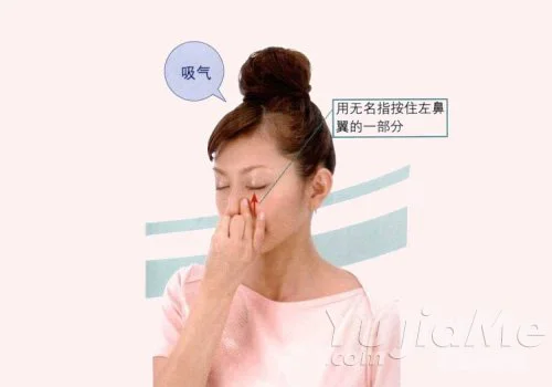 4、呼氣結束後,用無名指從下方將左鼻翼按住,用左鼻孔剩餘空隙用力吸氣。