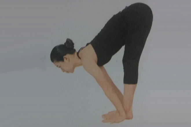 2、吸氣,脊柱向上伸展,向上抬升手臂,掌心朝前,從腰部開始向前彎曲,雙手落於腳外側地面上,掌心貼地,手臂伸直。雙腿伸展,與地面保持垂直,雙腳和雙掌緊壓地面,保持身體平衡。