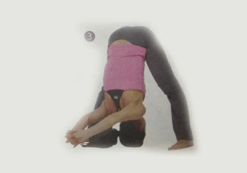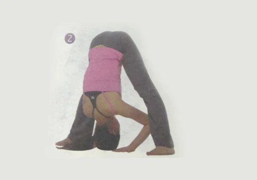 2、呼氣,頭和肩膀向後方仰起,上身軀幹前屈直至雙掌放在雙腳間的地面上。將軀體的重心放在兩腿上,彎曲雙肘,使頭頂著地,置於雙掌之間。頭、雙掌和雙腳應在一條直線上。
