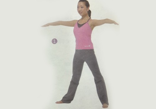 1、以山式站立。雙腳分開兩倍半肩寬的距離。雙臂側平舉,保持與地面平行。