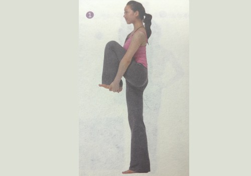 1、以山式站立。吸氣,屈左膝,抬左腿,雙手手指相扣在一起托住左腳掌。