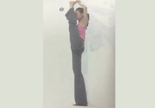1、以山式站立,吸氣。屈左膝,抬左腿,左手手指抓住左腳腳趾,右手扶右腰外,大拇指朝厚,保持平衡。
