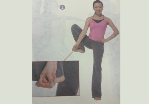 1、以山式站立。吸氣,向外屈右膝,以右手的拇指、食指及中指抓住右腳大腳趾。左手扶在左腰上,大拇指朝後,保持平衡。