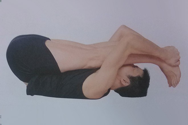 4、再次呼氣,回到動作2;吸氣,鬆開雙手,雙腿回到地面伸直,放鬆。