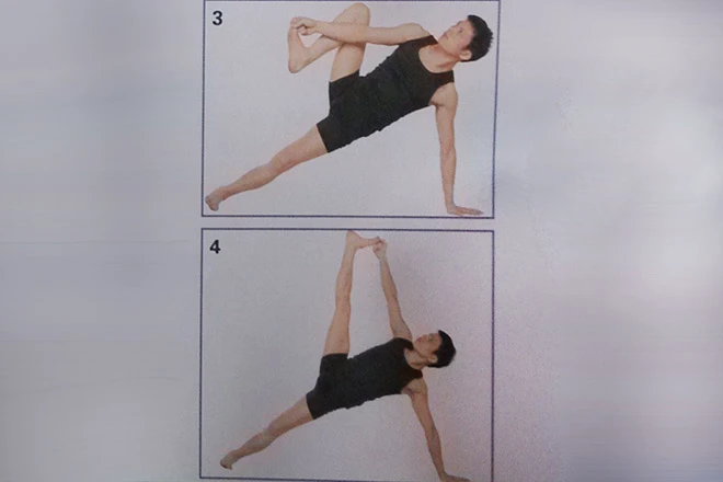 2、整個身體向左傾斜,帶動雙腳右轉90度。左腳外側牢牢地抵在地面上,把右腳放在左腳上,以左手、左腳支撐身體的重量,右臂向上伸展,與左臂成一條直線,雙眼看向右手手掌,軀幹保持繃直。