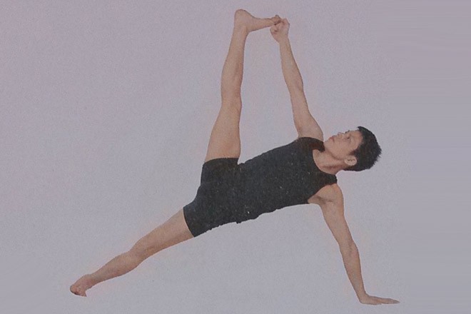 5、呼氣,右手鬆開右腳大腳趾,右腳回到左腳上。逐步回到動作1。然後身體朝右側傾斜,在身體右側重複這個體式。