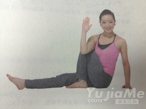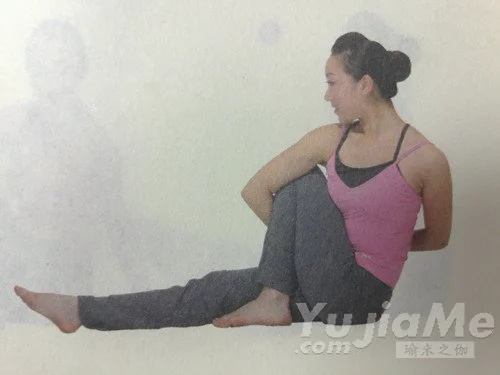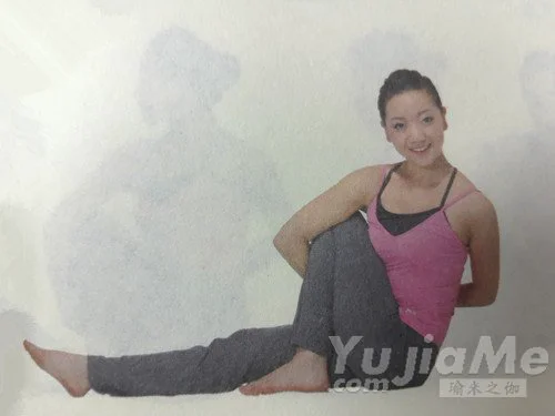 1、坐在地面上,雙腿向前伸直。彎曲左膝,把左腳腳底平放在地面上。左小腿觸碰左大腿。把左腳腳後跟貼近會陰,左腳內側觸碰伸出到右大腿內側。呼氣,同時脊柱向左側扭轉90°,使胸部越過彎曲的左大腿,把右臂放在左大腿上。