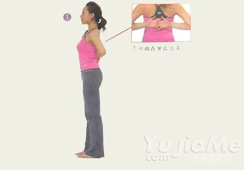 1、以山式站立。雙手貼背部,十指交叉,掌心向外,肩部和肘部盡量向後伸展,雙臂盡量抬高。
