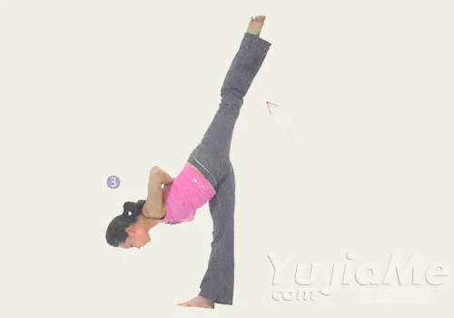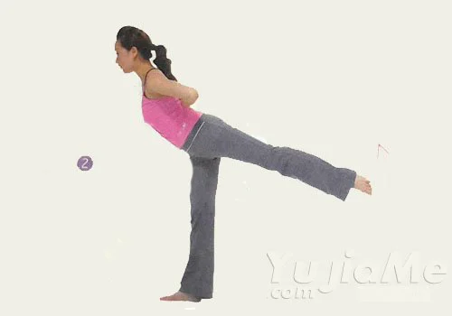 2、右腿直立,上身前傾,左腿保持伸直,向後抬離地面。軀幹與左腿保持在一條直線上。