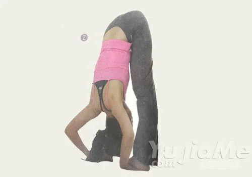 2、呼氣,上身繼續下壓,頭放在兩小腿之間,雙手肘部彎曲,向上提拉腳掌。背部和雙腿後側要充分伸展,該動作保持數秒,正常呼吸。吸氣,抬頭,保持2個呼吸,吸氣,雙手抬起,身體回到起始姿勢。