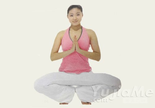 兩膝分開式吸氣,雙手舉過頭頂時呼氣。