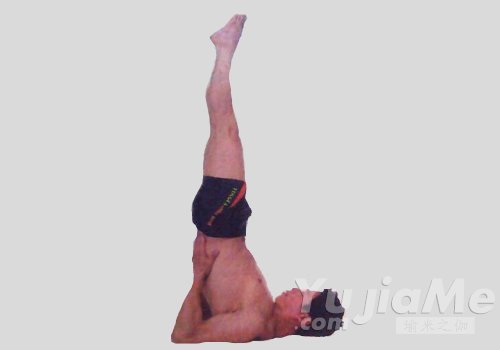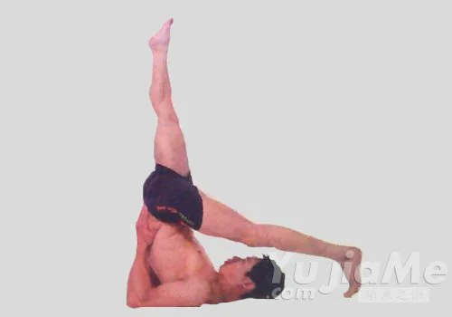2、屈左髖,放低左腿,左腳落在身體前傾的地面上,右腿保持向上伸展,骨盆端麗,不出現側傾,保持一段時間,回到肩倒立第一式,換另一側身體練習。