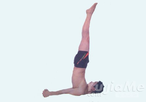 倒立時,雙腿,臀,背部在一條直線上,下巴抵胸骨,兩肩著地,手指相扣,肘關節伸直。