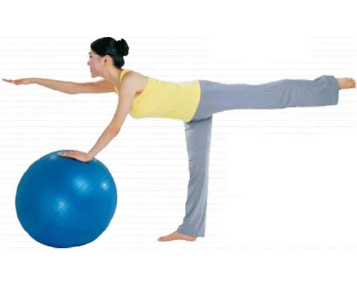 左手輕壓球面,身體迷續向前頃,同時抬高左腿,直到與地面平行。右臂慢慢向前伸直,手指指向前方,與左腿呈一條直線。保持此姿勢30秒,然後換另一側繼續練習。