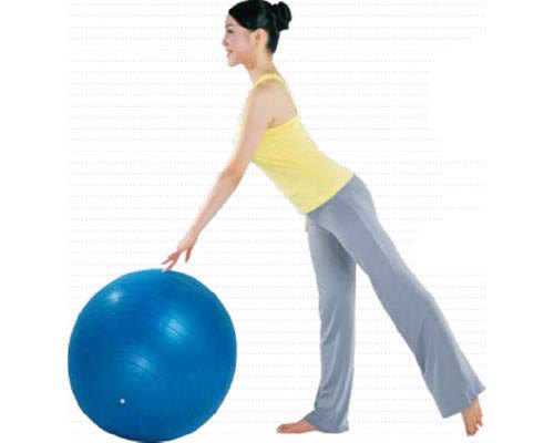 挺直腰背站立,將球放在身體前方0.5公尺處,身體慢慢前傾,左手扶住球面,左腿向後伸直,右腿保持直立,重心放在右腿上。