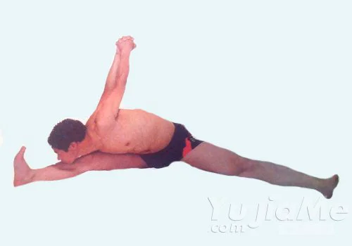 2、上身自腰部向下彎,用下巴碰觸右膝下部,雙臂充分向上伸展,盡量使雙臂保持與地面垂直,保持一段時間,重複做另一側。