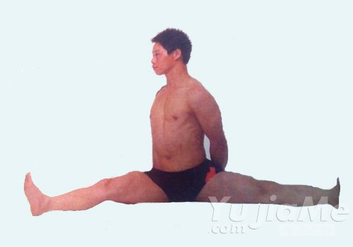1、坐在地面上,雙腿向前伸直,雙腿最大限度地向兩側分開,上身向右轉90°,雙手在背後十指相扣。
