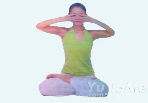 2、把手抬高到臉部,肘部與肩平,拇指放在耳孔處從而隔絕外部聲響。把食指放在上眼瞼,從而使這兩指按壓在整個眼球上,中指均勻地哎呀左右鼻孔。無名指放在上唇,小指壓住下唇。吸氣之後屏氣,盡你所能保持這個體式,把視覺和想像向內收。