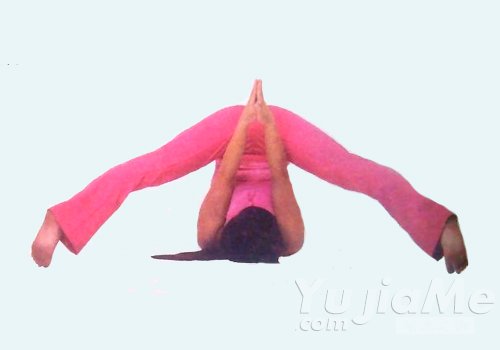 完成犁式,盡量寬闊地把兩腿分開,雙腳腳尖觸地,保持身體平穩;雙手在胸前合十,逐漸向上伸展手臂,提起兩腳腳跟,伸展雙膝,正常地呼吸,保持此姿勢一段時間。