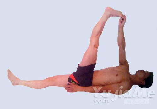 2、呼氣,在不改變頭和軀幹位置以及左腿不離開地面的情況下,把右臂和右腿向右側扭轉直到觸碰地面,不要鬆開抓著的腳趾,使右臂與肩平,保持這個體式數秒,右腿不要彎曲,正常地呼吸。
