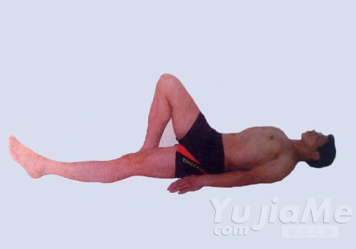 1、在臥手抓腳趾腿伸展式變化式的基礎上,吸氣,頭回到地面上,把右臂放在頭前,伸直右臂和右腿,始終抓住腳趾。