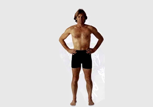 在一個流暢的動作中,膝蓋稍曲,邁開雙腳,與髖部同寬,確定雙腳平行。與邁開雙腳同步,把雙手放在腰部接觸收腹收束,引導呼吸向上充滿背部和胸腔之間的空間。在不過分伸展膝關節的前提下把腿盡裡伸直。當腳穩固地站在墊子上形成一個穩固的根基時,雙手就能感覺到會陰收束的成效。