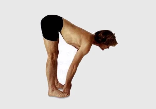 保持手與下腹的接觸以確保繼續運用收腹收束。膝蓋稍曲以便髖關節旋轉,身體向前彎曲,在筋部處摺疊。從收腹收束中放鬆雙手並用食指和中指抓住兩個大腳趾。