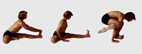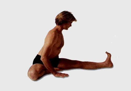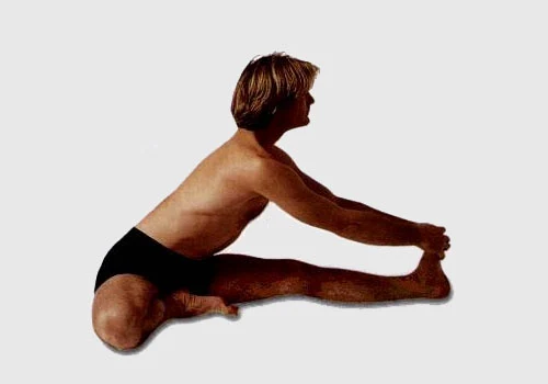 抓住左腳,胸腔上提離開伸直的左腿直至手臂伸直。肩膀放平,臂部坐於墊子上。為糾正脊推的扭曲動作,左臀部往後拉,右髖部往前旋轉。運用收束,把肚臍置於直腿內側的中間。注視第三眼。