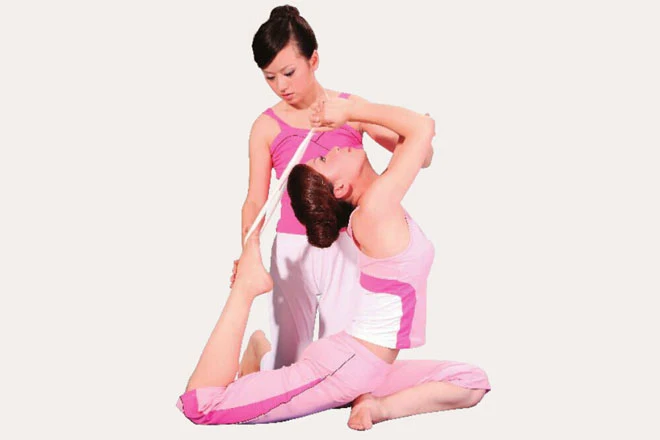 如果無法完成最後的動作,可用毛巾輔助,只要感受腿部向頭部靠攏即可。可讓教練用手按壓你的腳面,以使小腿更好地向頭部靠攏。