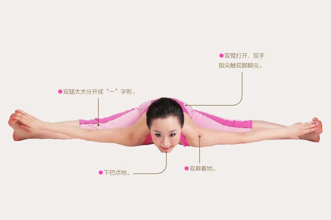 動作過程中,保持背脊的平直。若不能使雙腿分開成“一”字形,盡力而為,到自己極限即可。同時把腳跟盡量蹬直,否則會使膝蓋內側有疼痛感。